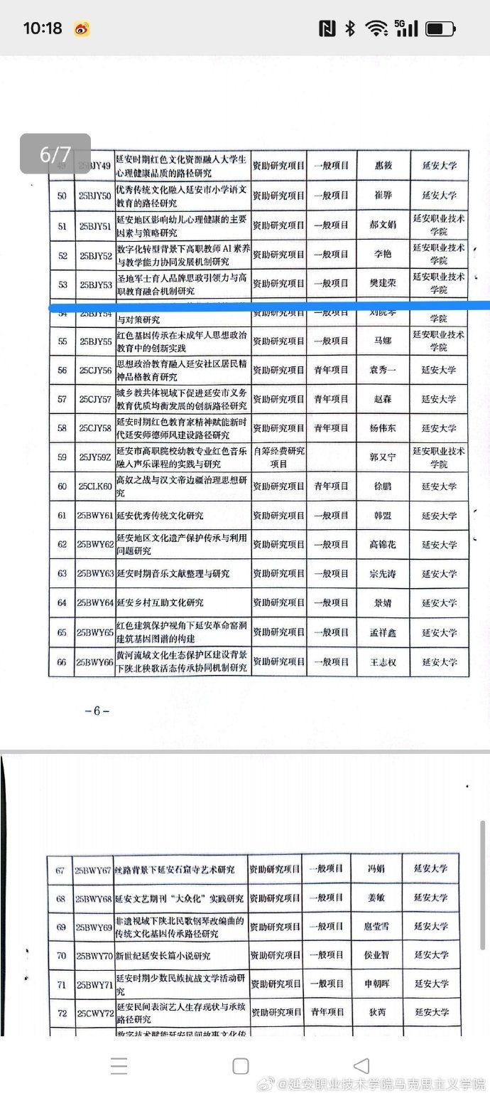 近日,延安市社会科学界联合会公布了延安市社会科学专项资金2025年度规划项目立项项目名单,延安职业技术学院马克思主义学院教职工主持申报的三项课题获准立项。分别是姜静主持的“思想道德与法治法治”融入高职思政课教学创新与实践效果研究”;高倩楠主持的“延安精神融入思想政治教育的实践创新研究”;樊建荣主持的“圣地军士育人品牌思政引领力与高职教育融合机制研究”。